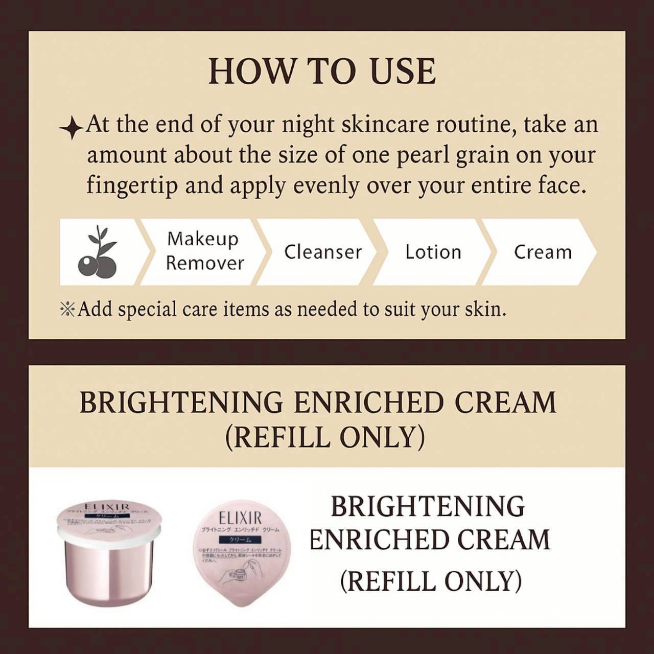 The Elixir White Enriched Clear Cream TB is a luxurious nighttime whitening cream by Shiseido’s premium skincare brand, ELIXIR.